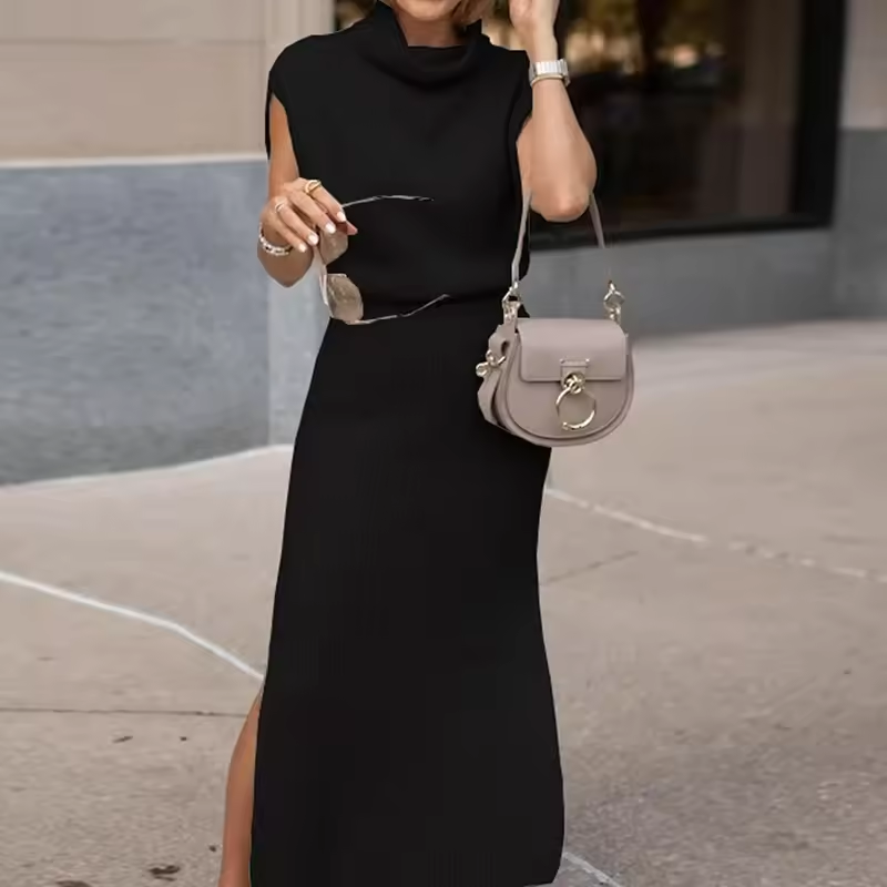 Cowl Neck Waisted Side Slit Midi Sweater Dress