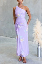 One Shoulder Cut Out Waist Floral Print Draped Maxi Dress