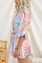 Half Sleeves Button Up Bow Waist Printed Romper