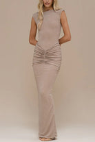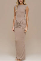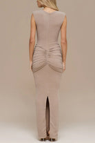 Elevate your evening wardrobe with this captivating sleeveless maxi dress designed to turn heads. Intricate hotfix embellishments sparkle across the fabric, while strategic ruching sculpts and flatters your figure. The dramatic back slit offers a bold peek of skin and ensures comfortable movement, making this piece perfect for galas, weddings, and upscale celebrations. Crafted for those who refuse to blend in, this dress delivers red-carpet glamour with an undeniable edge. Command attention and confidence in every step.