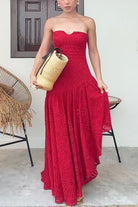 Make a bold statement in this captivating strapless maxi dress featuring intricate hollow-out lace that showcases your elegance. The asymmetrical hemline creates dynamic movement and visual interest, distinguishing this piece from conventional formal wear. Designed to flatter, the structured bodice provides support while the flowing skirt offers comfort and grace. Whether you're attending a gala, wedding, or special celebration, this dress commands attention with its sophisticated lace detailing and contemporary silhouette. The versatile design pairs beautifully with heels and minimal accessories, letting the dress take center stage. Invest in a showstopping piece that combines timeless allure with modern edge—perfect for anyone seeking to make an unforgettable impression.