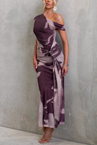 Asymmetrical Shoulder Draped Front Printed Maxi Dress