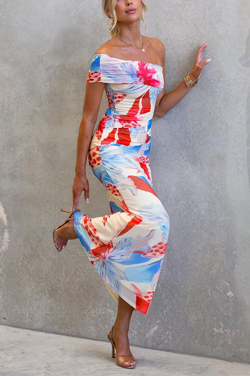 Asymmetrical Shoulder Ruched Floral Print Maxi Dress