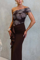 Asymmetrical Shoulder Ruffle Detail Printed Maxi Dress