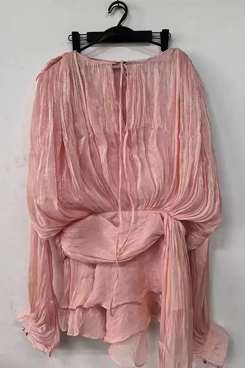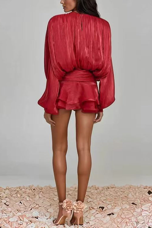 Moxidress Lantern Long Sleeves Draped Ruffle Layered Mini Dress with Shorts