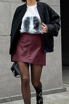 Command attention in this high-rise faux leather A-line mini skirt—a wardrobe essential that combines edge with elegance. The premium faux leather construction offers a luxe look without compromise, while the flattering A-line cut and high waistband create an instantly polished silhouette. Whether you're dressing up for a night out or adding attitude to your casual rotation, this versatile piece delivers confidence-boosting style. Invest in a skirt that works as hard as you do, effortlessly transitioning from season to season.