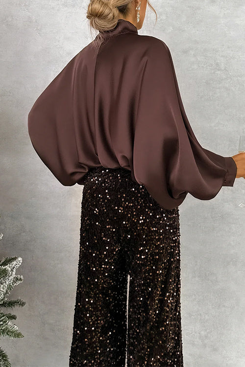 Make a statement with this elegant satin top featuring a refined bow neckline and dramatic batwing sleeves. The luxurious fabric drapes gracefully, creating a sophisticated silhouette that flatters every figure. Whether you're heading to the office, a dinner date, or weekend brunch, this versatile piece effortlessly transitions from day to night. The delicate bow detail adds personality without overwhelming your look, while the flowing sleeves provide movement and comfort. Designed for the modern woman who refuses to compromise on style, this top is the investment piece your closet has been waiting for.