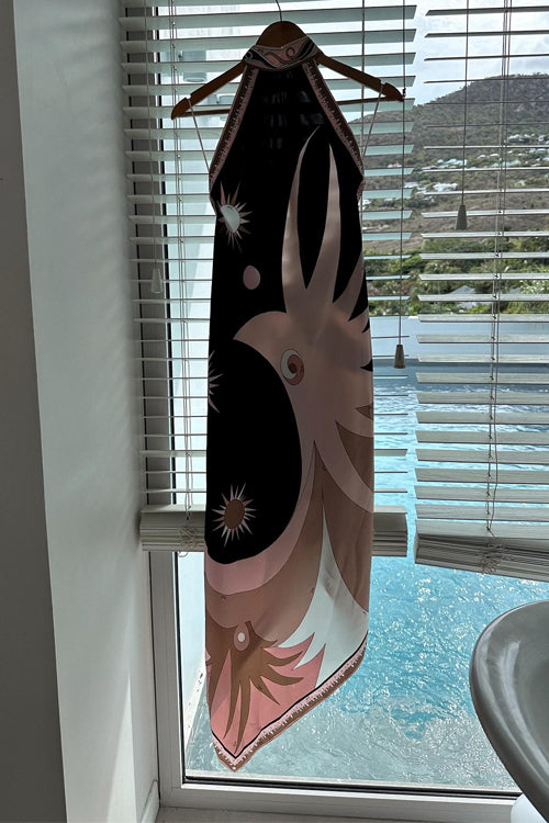 Make a striking impression with the Moxidress halter neck midi dress, crafted from luxurious printed satin. Its open back and asymmetric hem create a unique silhouette that blends elegance with contemporary style. Perfect for special occasions, this dress highlights your confidence and grace.