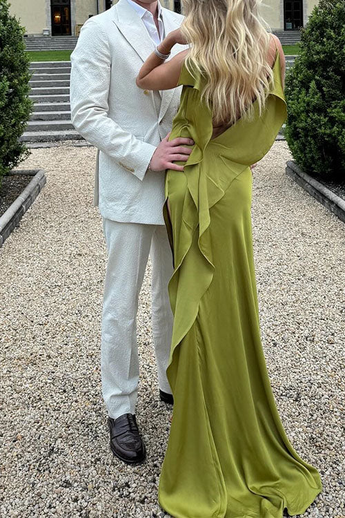 Moxidress High Slit Back Drape Cascading Satin Maxi Cami Dress