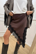 Make a statement with this captivating satin skirt that combines timeless elegance with contemporary design. Crafted from premium satin fabric, it offers a luxurious feel and graceful drape that catches the light beautifully. Intricate lace trim details add refined sophistication, while the asymmetrical cut and side slit inject personality and movement into your silhouette. This distinctive piece works effortlessly from evening events to upscale casual settings, pairing seamlessly with everything from silk blouses to minimalist sweaters. The irregular hemline ensures you'll command attention while maintaining an air of understated glamour. Invest in a skirt that celebrates your individual style and versatility.