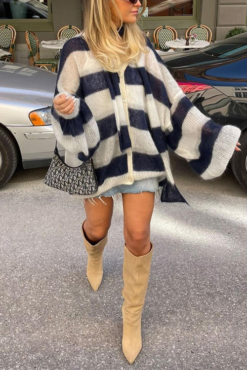 • Unleash your fashionable, confident and bold side with our Moxidress Lantern Sleeves Button Down Color Block Stripes Sweater with Scarf. Trendy lantern sleeves, a stylish button down design and striking color block stripes, paired with a matching scarf, creates an effortlessly chic and put-together look. Take your style game to the next level today!