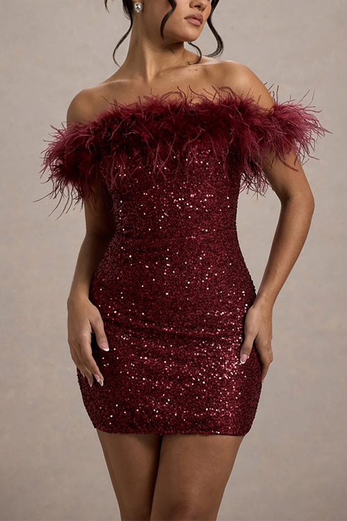 Moxidress Off Shoulder Feather Trim Sequin Mini Party Dress