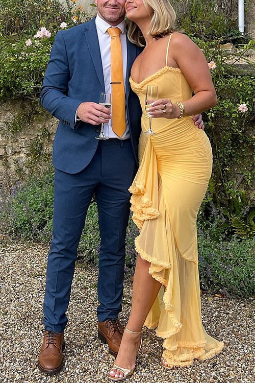 Moxidress Spaghetti Strap Mesh Splice Draped Ruffle Maxi Dress