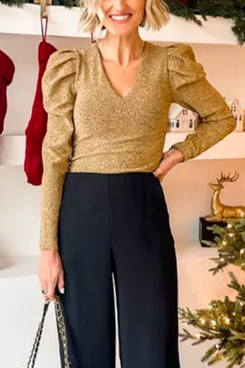Look your best in this stylish V-neck long sleeve shiny top! Its shimmering fabric catches the eye and adds just the right amount of subtle sophistication. Perfect to dress up any outfit, from everyday jeans to a night on the town!
