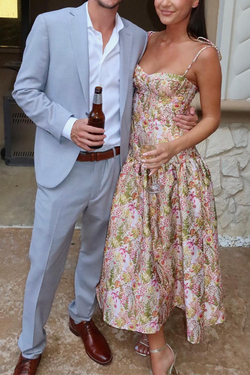 Tie Shoulder Drop Waist Jacquard Midi Cami Dress
