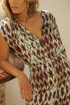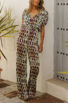 V Neck Short Sleeves Waisted Printed Straight Leg Jumpsuit