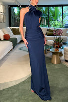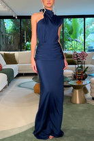Halter One Shoulder Ruched Satin Maxi Dress