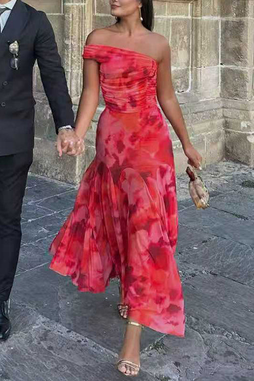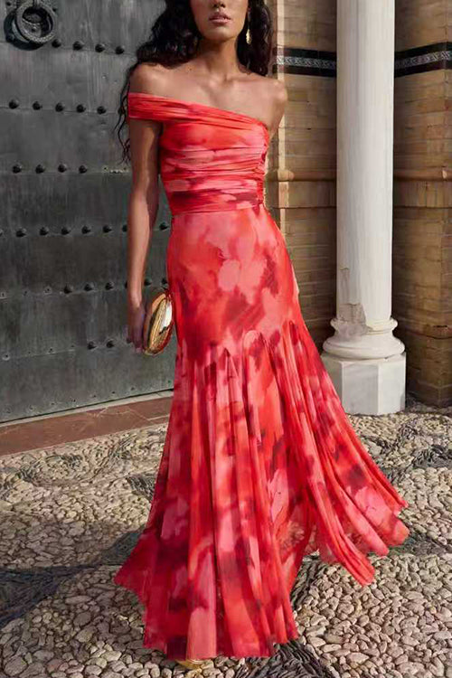 Off Shoulder Ruched Crop Top High Rise Maxi Skirt Printed Set