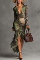 V Neck Zebra Stripe Print Lace Ruffle Trim Asymmetrical Midi Dress