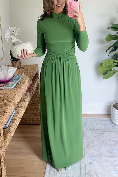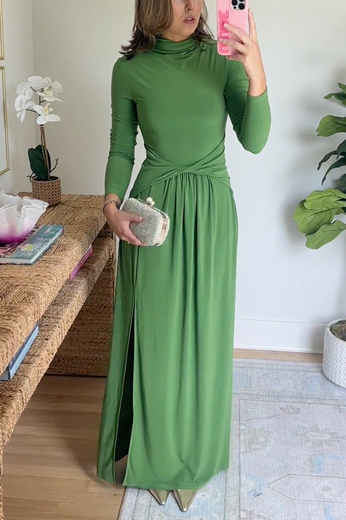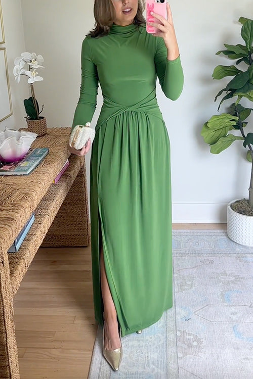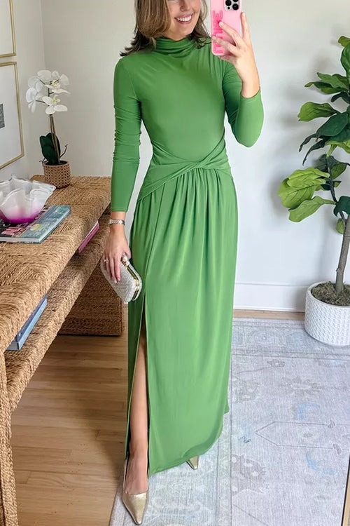 High Neck Long Sleeves Side Slit Maxi Dress
